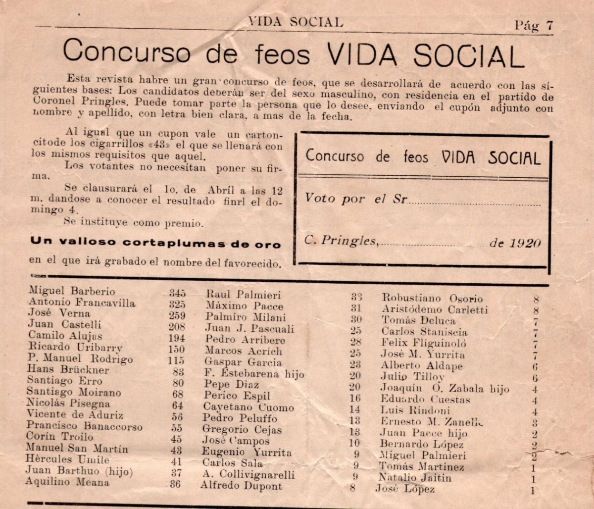 La nota del Archivo Histórico Municipal, expresa : "¿Se imaginan si hoy en Pringles hacemos un concurso de "feos"? ¡Sería un escándalo! Pero no lo era en 1919".