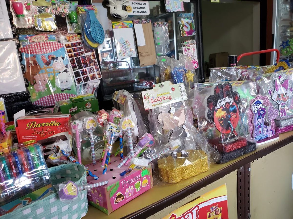 Haciendo un rápido paneo por el comercio, observamos que tiene desde disfraces para niños, bolsitas de organza, rosas de goma Eva, cinta decoupage, denarios, estampitas, adornos para tortas, llaveros, piñatas, vasos, platos, mantel, invitaciones, globos, llaveros Squishy, decoración para torta, muñeco de porcelana, globos chicos y gigantes, bengalas de humo en colores, velas musicales, artículos de limpieza, aromatizantes, spray Candela para pintar el pelo…. Y muchas cosas más