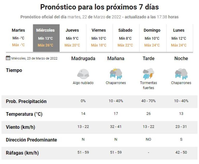 Mientras que para el jueves pronostica una jornada ventosa con precipiitaciones, con ráfagas muy fuertes desde el sector sur.