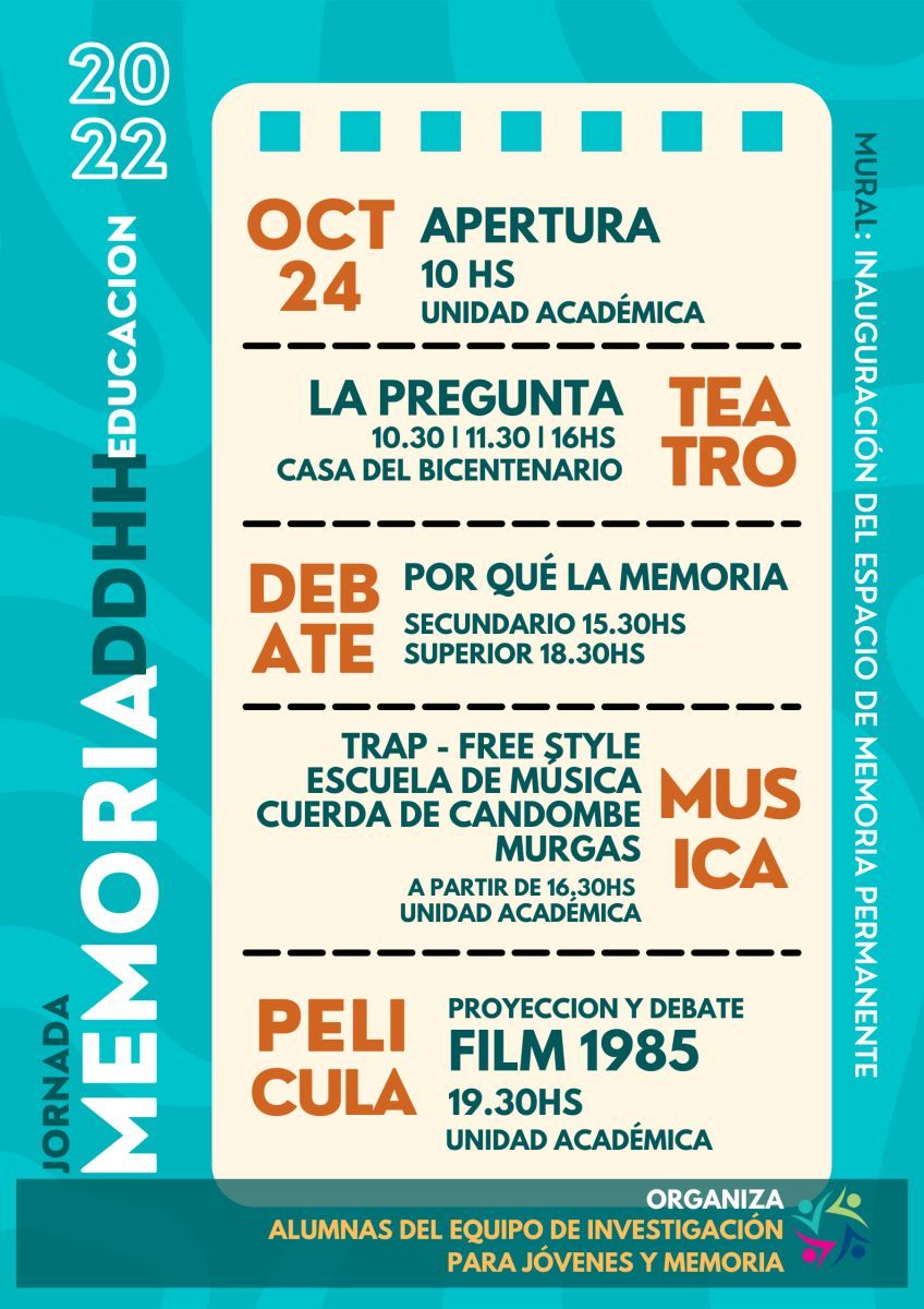 Tendrá desarrollo este lunes 24 de Octubre, en la sede de la Unidad Académica (UA), donde se pintará un mural, con diseño de Rosana Casataro, se presentará una obra de teatro y no faltará el debate, música con artistas locales, y la proyección del film “Argentina 1985”