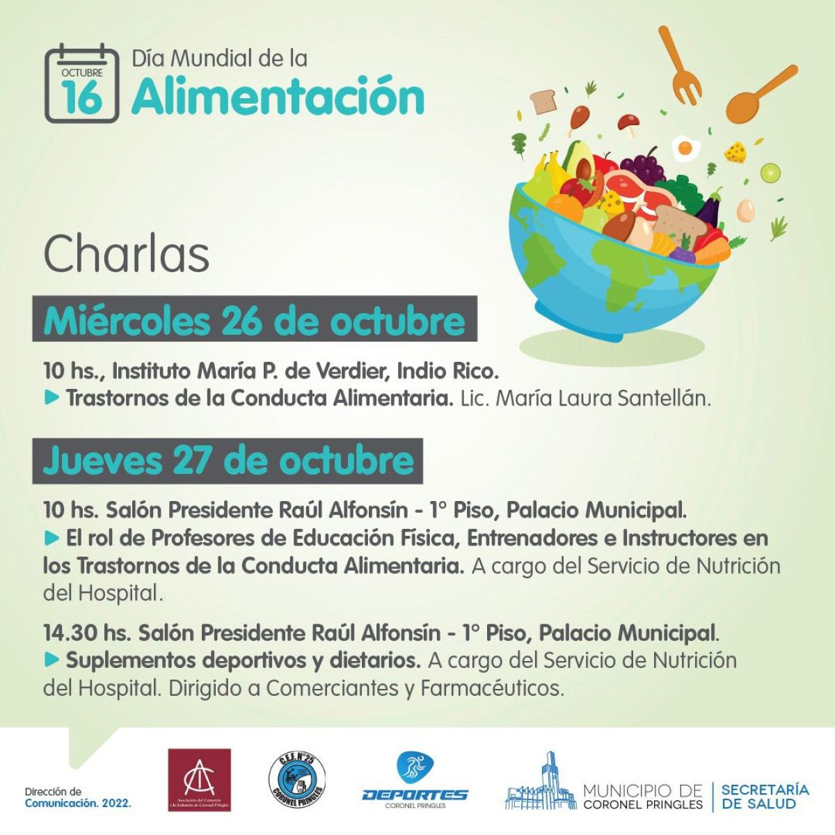 El jueves 27, a las 10 hs. en el Salón Presidente Raúl Alfonsín (1° Piso, Palacio Municipal), el Servicio de Nutrición del Hospital dará una charla a los Profesores de Educación Física, Entrenadores e Instructores sobre el rol de los Trastornos de la Conducta Alimentaria.
