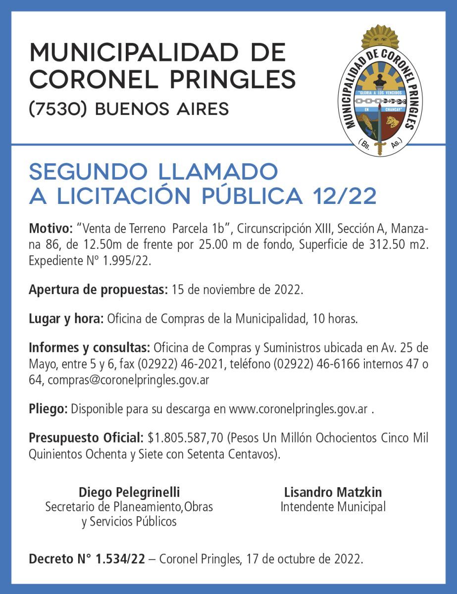 Pliego: Disponible para su descarga en www.coronelpringles.gov.ar .