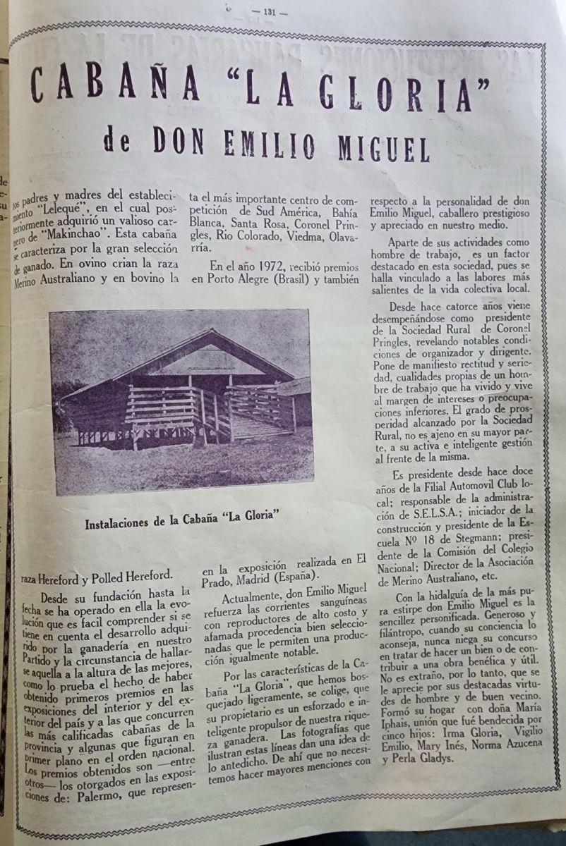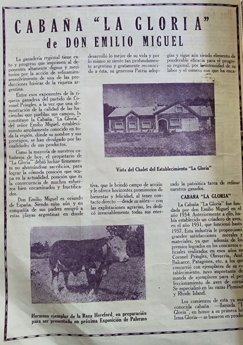 La ganadería local, tuvo y tiene dignos exponentes de la riqueza ganadera del partido de Coronel Pringles, como una demostración de la calidad de hacienda que poblaron y pueblan sus campos. Hoy, nos ocuparemos de los orígenes de la Cabaña “La Gloria”.
