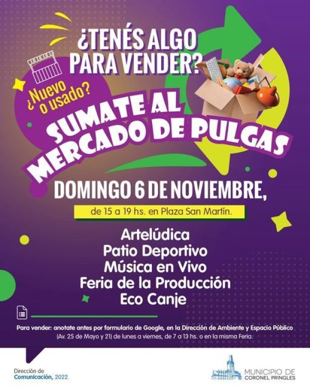 **MERCADO DE PULGA: Como se viene anunciando, el mismo es organizado por las áreas municipales de Ambiente y Espacio Público, Cultura, Deportes y Producción y tendrá lugar en la Plaza San Martín, a las 15 horas y se extenderá hasta las 19 horas. Una oportunidad para que la comunidad pueda llevar lo que desee vender, nuevo o usado y también comprar lo que los