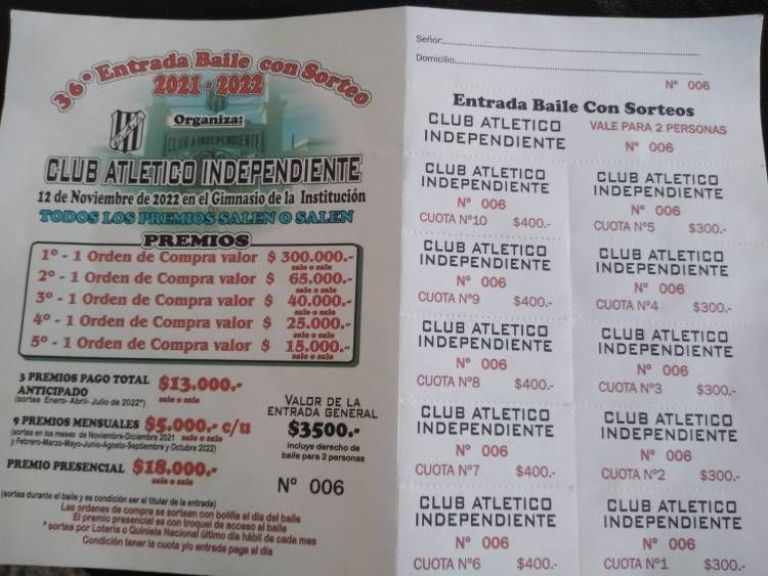 Independiente hará su tradicional baile con sorteos el 12 de noviembre y se estarán entregando importantes premios: uno de ellos sorteo presencial por 18 mil pesos; y luego los cinco premios a quienes adquirieron el bono: el primer premio 300 mil pesos; segundo 65 mil; tercero 40 mil pesos; cuarto 25 mil pesos, y quinto 15 mil.