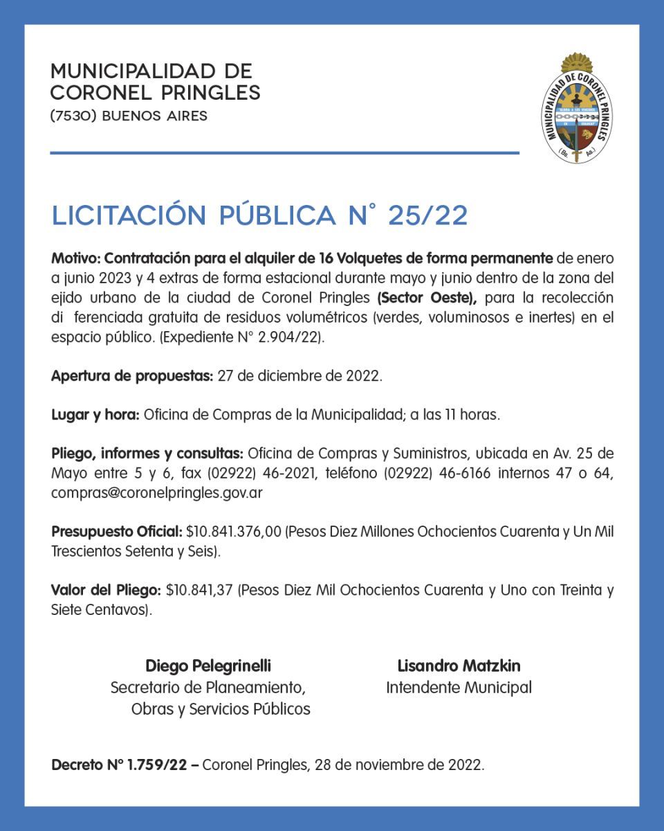 Motivo: Contratación para el alquiler de 16 Volquetes de forma permanente de enero a junio 2023 y 4 extras de forma estacional durante mayo y junio dentro de la zona del ejido urbano de la ciudad de Coronel Pringles (Sector Oeste), para la recolección diferenciada gratuita de residuos volumétricos (verdes, voluminosos e inertes) en el espacio público. (Expediente N° 2.904/22).