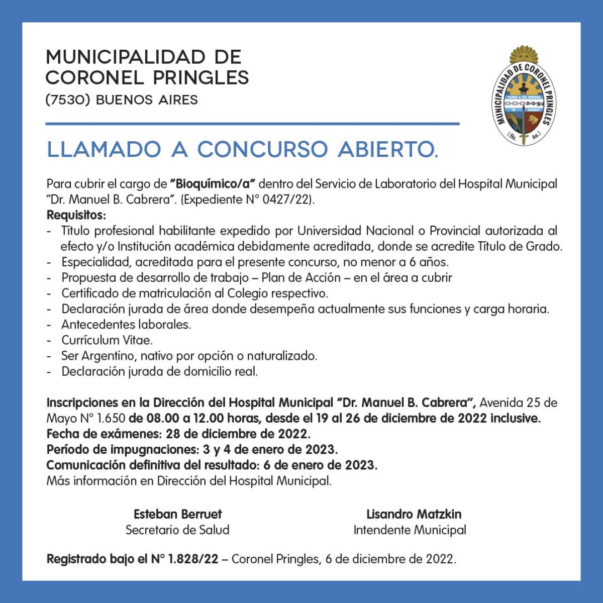 Para cubrir el cargo de “Bioquímico/a” dentro del Servicio de Laboratorio del Hospital Municipal “Dr. Manuel B. Cabrera”. (Expediente N° 0427/22)