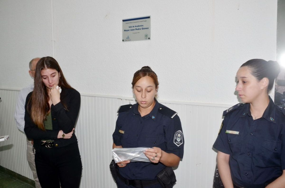 Seguidamente se descubrió la placa con la cual se impuso el nombre de Mayor Juan Pedro Gómez a la Sala de Academias, efectivo fallecido en enero de 2022.