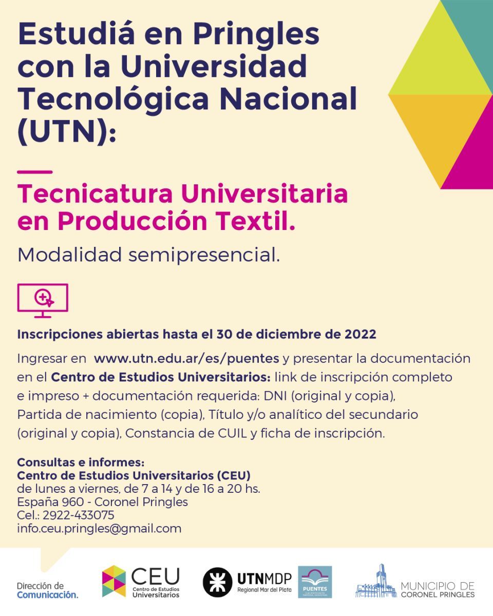 El Jefe Comunal clarificó al respecto: “Vamos a tener una nueva oferta educativa a nivel universitario en Pringles para el año 2023. En este caso es un convenio que firmamos con la Provincia de Buenos Aires, para que la Universidad Tecnológica Nacional dicte en Coronel Pringles la Carrera de Tecnicatura Universitaria en emprendimientos Textiles”.