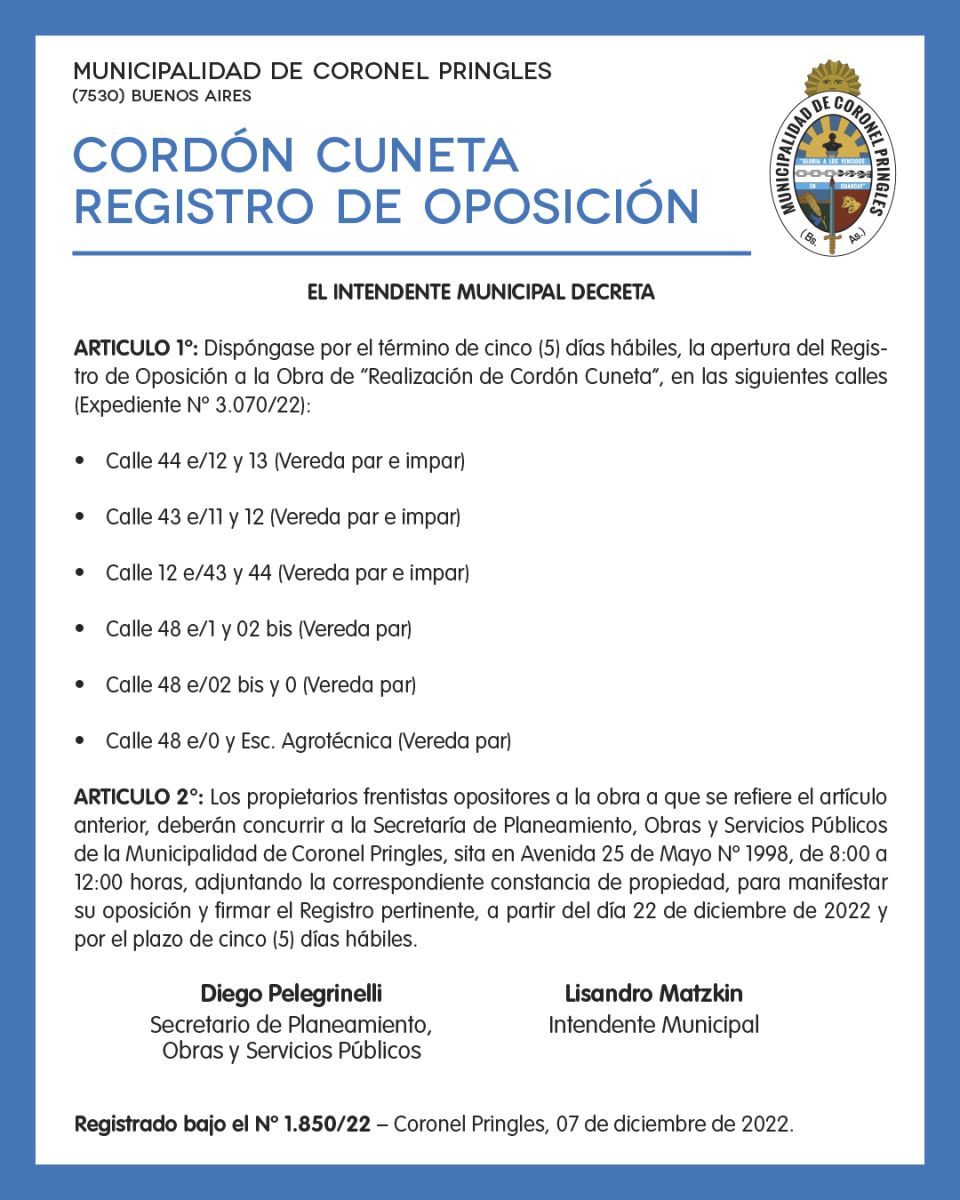 ARTICULO 2°: Los propietarios frentistas opositores a la obra a que se refiere el artículo anterior, deberán concurrir a la Secretaría de Planeamiento, Obras y Servicios Públicos de la Municipalidad de Coronel Pringles, sita en Avenida 25 de Mayo Nº 1998, de 8:00 a 12:00 horas, adjuntando la correspondiente constancia de propiedad, para manifestar su oposición y firmar el Registro pertinente, a partir del día 22 de diciembre de 2022 y por el plazo de cinco (5) días hábiles.