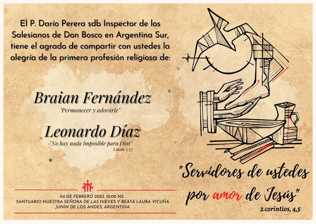 El Padre Inspector, Darío Perera, invita a la primera profesión religiosa de los novicios Braian Fernández y Leonardo Díaz que se llevará adelante el próximo 4 de febrero en el Santuario Nuestra Señora de las Nieves y beata Laura Vicuña, de la ciudad de Junín de los Andes bajo el lema “Servidores de ustedes por amor de Jesús” (1 Cor 4, 5).