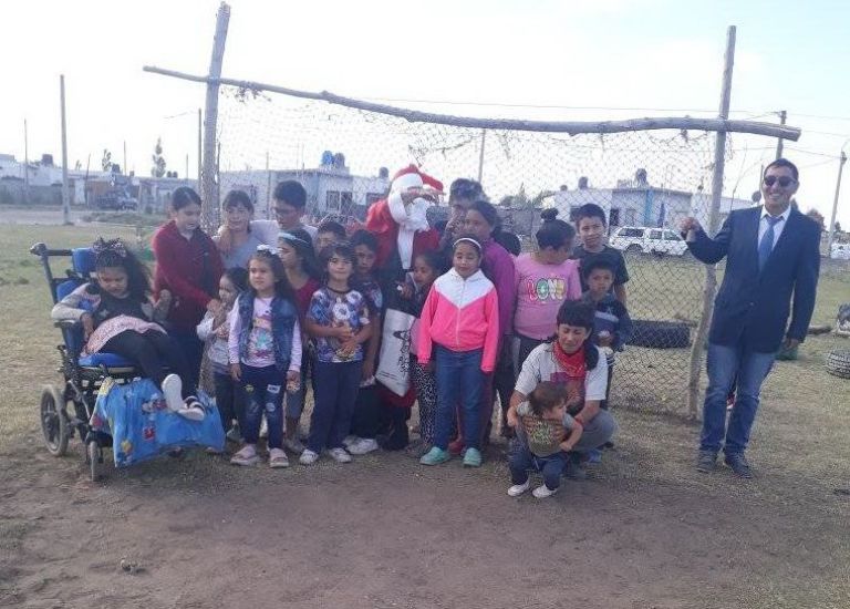 Se vistió de Papá Noel y recorrió Pringles repartiendo golosinas