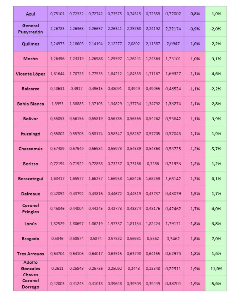 Lo mismo sucede en el fondo de la tabla donde aparecen como perjudicados municipios de todos los colores políticos posibles. Esta tendencia se repite si se analiza el devenir del CUD entre el 2016 y la actualidad. Arrecifes, Salliquello, General Madariaga, General Paz, General Arenales, General Villegas, Marcos Paz, General Alvear, Tapalqué, Cañuelas y Ayacucho son los que vienen acumulando mayores disminuciones de la coparticipación provincial que reciben.