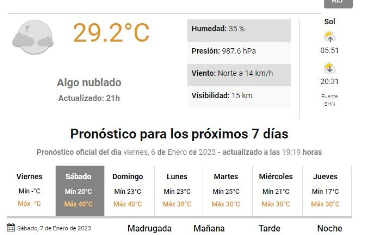 Según el Servicio Meteorológico Nacional, este sábado la temperatura máxima podría ascender a los 40 grados. En cuanto a la mínima, será de 20 . El cielo estará parcialmente nublado, pero no se esperan precipitaciones. El viento será del norte, a un promedio de 40 kilómetros por hora.