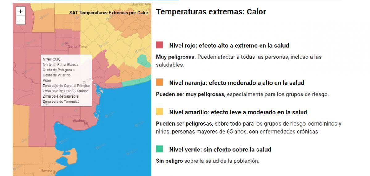 De acuerdo al organismo, en el sur de la Provincia de Buenos Aires habrá temperaturas extremas, cercanas a los 40 grados en Bahía Blanca, Patagones, oeste de Villarino, Puan y las zonas bajas de Coronel Pringles, Coronel Suárez, Saavedra y Tornquist.