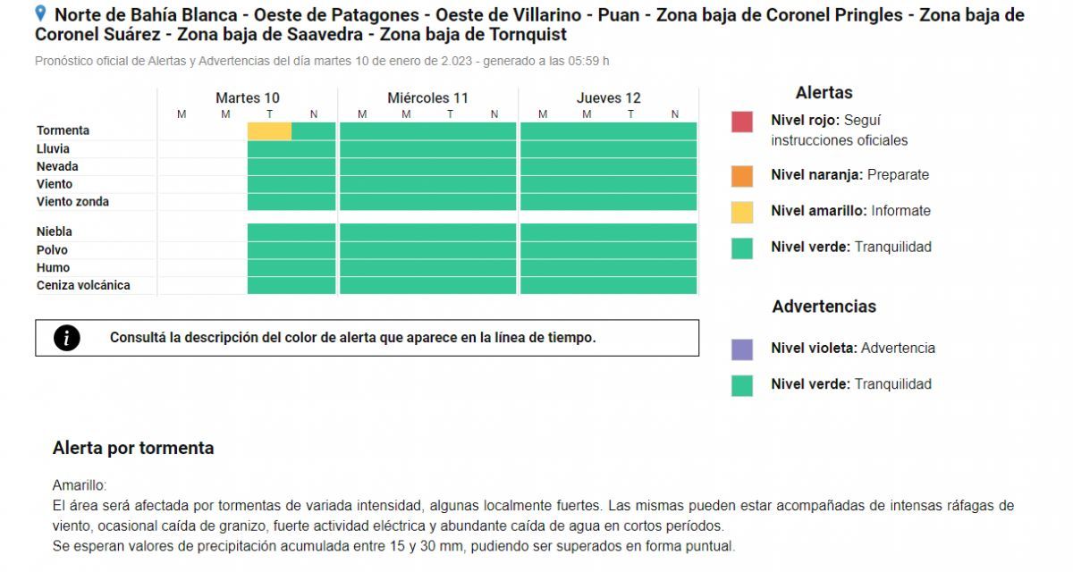 El primero de ellos corresponde a esta tarde: según se explica en la página web del ente, el alerta comprende a la zona Norte de Bahía Blanca - Oeste de Patagones - Oeste de Villarino - Puan - Zona baja de Coronel Pringles - Zona baja de Coronel Suárez - Zona baja de Saavedra - Zona baja de Tornquist