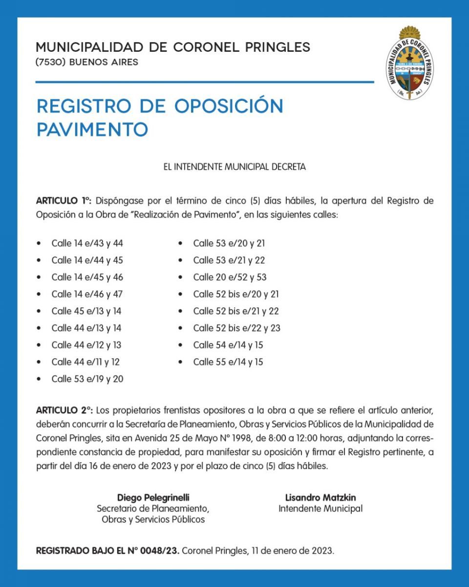 ARTICULO 2°: Los propietarios frentistas opositores a la obra a que se refiere el artículo anterior, deberán concurrir a la Secretaría de Planeamiento, Obras y Servicios Públicos de la Municipalidad de Coronel Pringles, sita en Avenida 25 de Mayo Nº 1998, de 8:00 a 12:00 horas, adjuntando la correspondiente constancia de propiedad, para manifestar su oposición y firmar el Registro pertinente, a partir del día 16 de enero de 2023 y por el plazo de cinco (5) días hábiles.