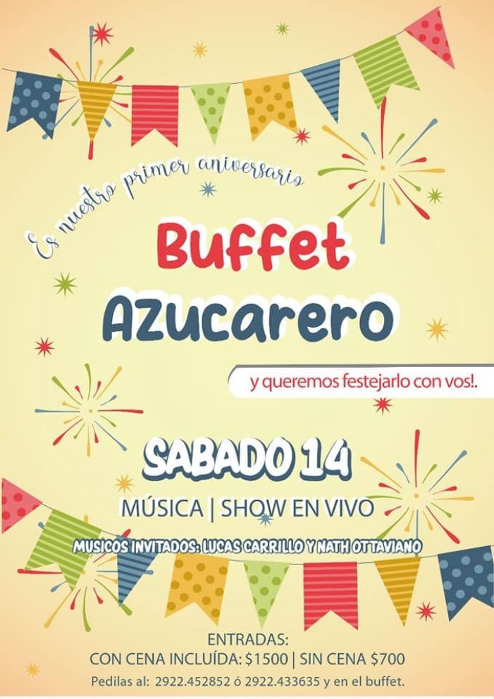 A un año y un mes de su apertura, Buffet Azucarero quiere celebrarlo con los pringlenses. Por ello, este sábado 14 brindará una cena en el playón, con música en vivo. Ya se pueden pedir las entradas