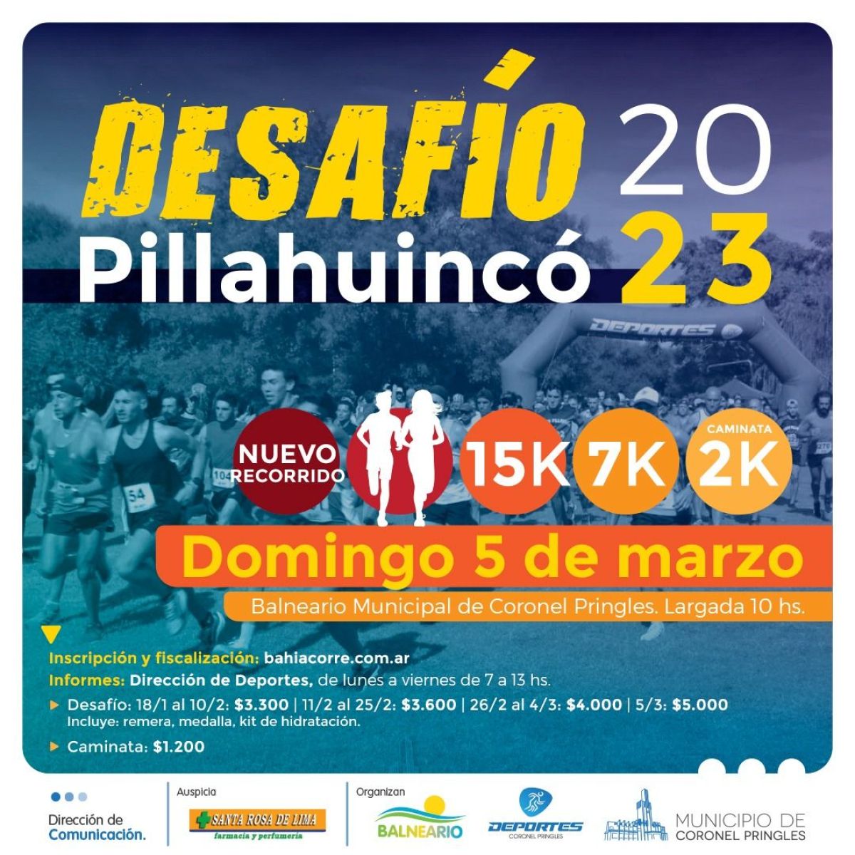 En síntesis, la competencia Desafío Pillahuincó 2023 se realizará el domingo 5 de marzo, con largada a las 10 horas, en el Balneario Municipal, con un recorrido de 7 y de 15 kilómetros, que se le suma 2 kilómetros de caminata, esta última con una inscripción de $1.200.
