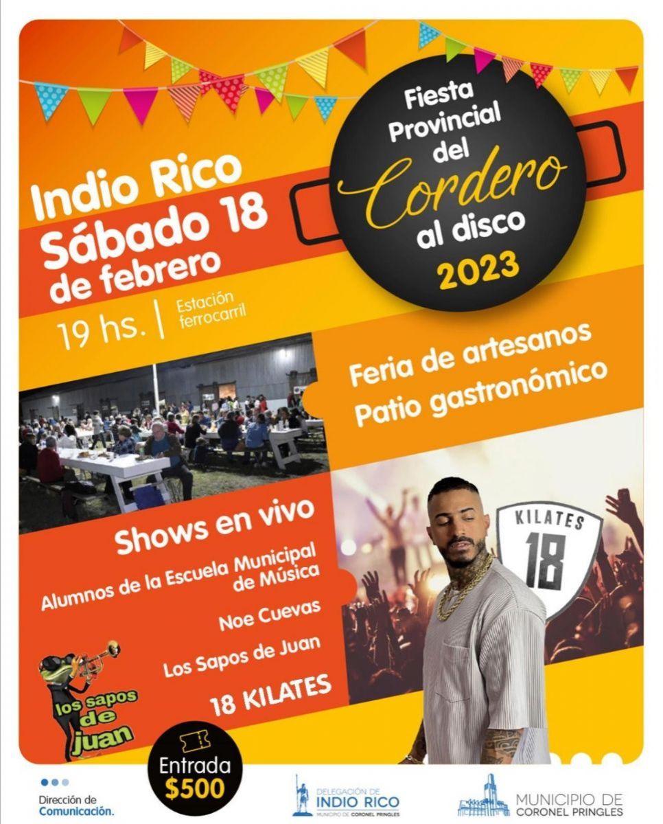 La 2° Fiesta Provincial del Cordero al Disco será el día sábado 18 de febrero en el predio de la Estación del Ferrocarril. La entrada a la fiesta tendrá un valor de 500 pesos. Actuarán alumnos de la Escuela Municipal de Música, Leandro Casey, Noelia Cuevas, Los Sapos de Juan y el show principal estará a cargo de 18 Kilates. â¨Habrá además, feria de artesanos, patio de juegos y patio gastronómico.
