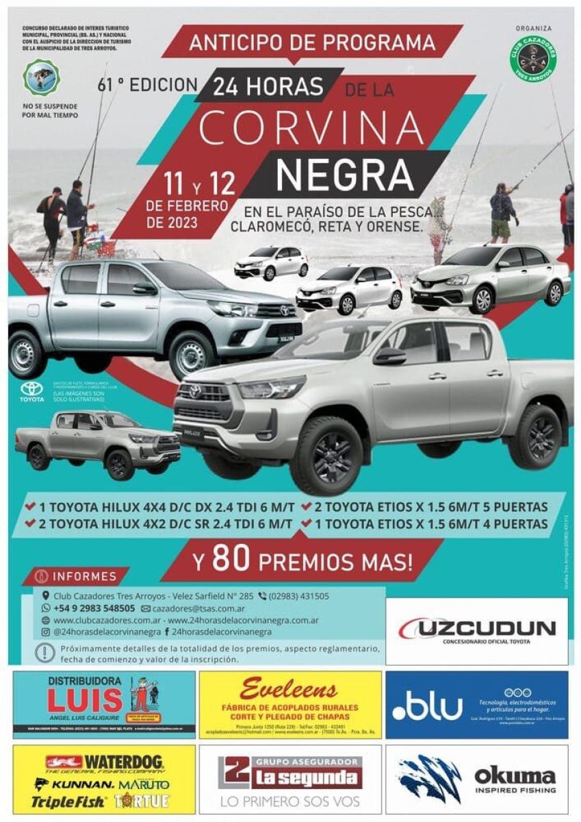 El concurso que organiza el Club Cazadores de Tres Arroyos repartirá más de 50.000.000 de pesos en premios que incluyen tres camionetas y tres autos Toyota 0 km: una Hilux 4×4, dos Hilux 4×2, dos Etios 5 puertas y un Etios 4 puertas.
