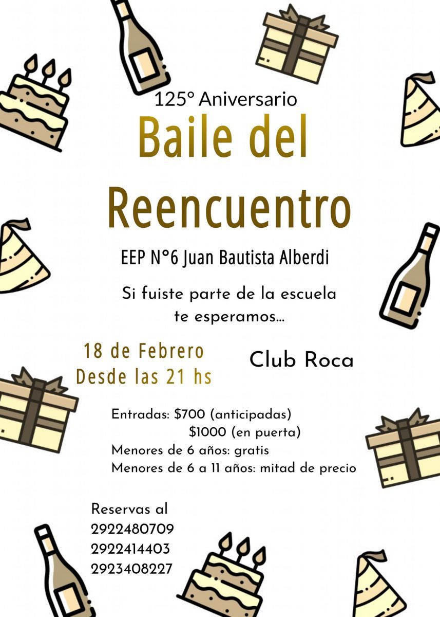 Con motivo de celebrar sus 125 años de vida, la Escuela Primaria N°6 comienza a festejarlo con un baile del reencuentro. Será el sábado 18 de febrero a la hora 21.00 en el Club Roca, y se invita a quienes hayan pasado por la entidad educativa