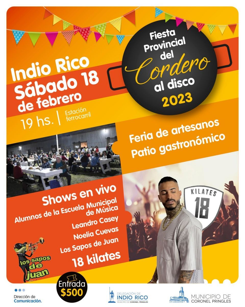 La gran fiesta de la localidad de Indio Rico, ofrecerá variedad gastronómica, artistas locales y un cierre a puro ritmo con 18 Kilates. Será la 2da. edición de la Fiesta Provincial del Cordero al Disco y se espera gran concurrencia.