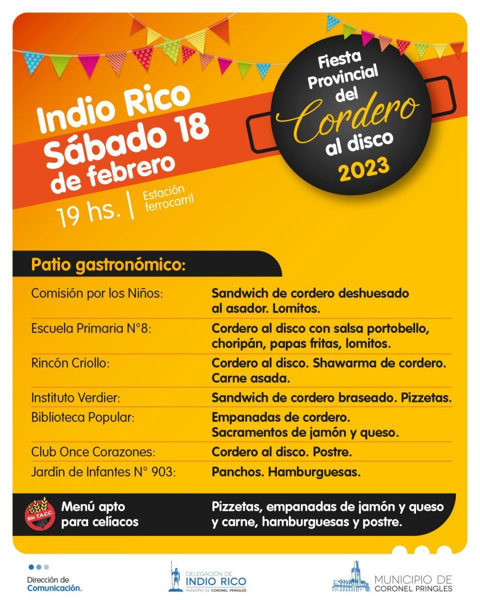Indio Rico se prepara para celebrar una nueva edición de la Fiesta Provincial del Cordero al Disco. Será el segundo evento en la localidad, este sábado 18 de febrero, con patio gastronómico y shows musicales. El sábado saldrá un colectivo de nuestra ciudad hasta Indio Rico