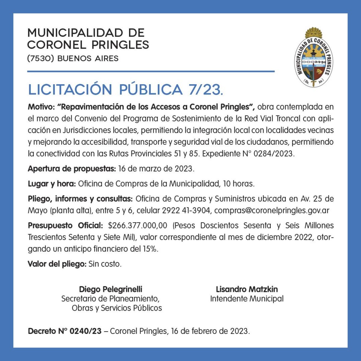 Motivo: “Repavimentación de los Accesos a Coronel Pringles”, obra contemplada en el marco del Convenio del Programa de Sostenimiento de la Red Vial Troncal con aplicación en Jurisdicciones locales, permitiendo la integración local con localidades vecinas y mejorando la accesibilidad, transporte y seguridad vial de los ciudadanos, permitiendo la conectividad con las Rutas Provinciales 51 y 85. Expediente N° 0284/2023.
