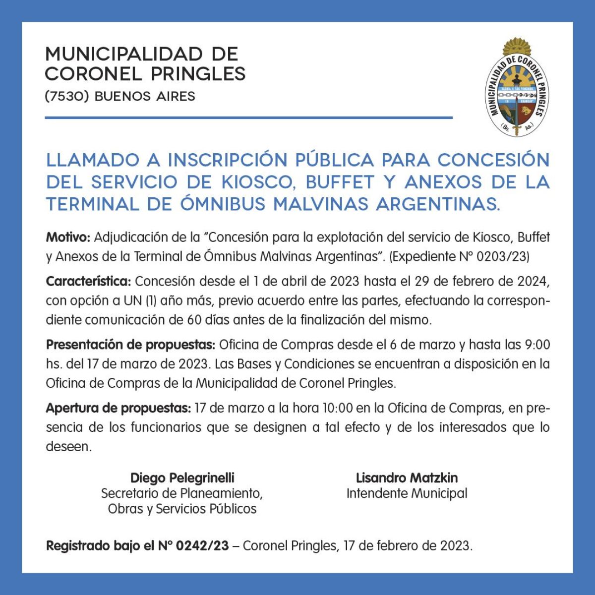 Presentación de propuestas: Oficina de Compras desde el 6 de marzo y hasta las 9:00 hs. del 17 de marzo de 2023. Las Bases y Condiciones se encuentran a disposición en la Oficina de Compras de la Municipalidad de Coronel Pringles.