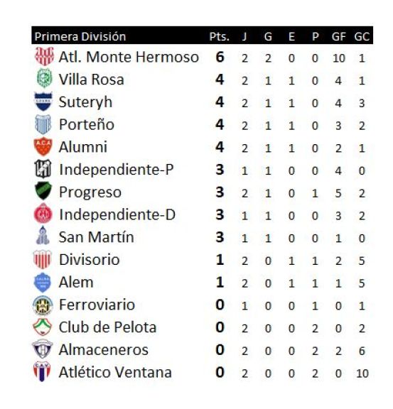 1°) Progreso, Almaceneros 6 puntos; 3°) Alumni 4; 4°) Independiente CP (un partido menos), Suteryh, Atlético Monte Hermoso, Porteño, Divisorio, Atlético Ventana 3; 10°) Ferroviario (un partido menos), Villa Rosa y San Martín (un partido menos) 1; 13°) Alem, Pelota e Independiente CD (un partido menos) 0.