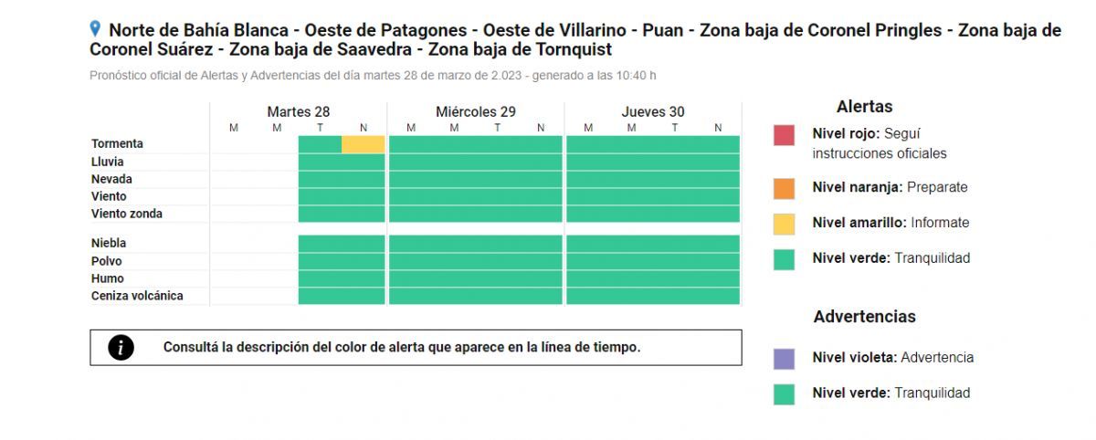 Un nuevo alerta amarillo para Pringles y una amplia zona de influencia fue anunciado por el Servicio Meteorológico Nacional para las próximas horas.