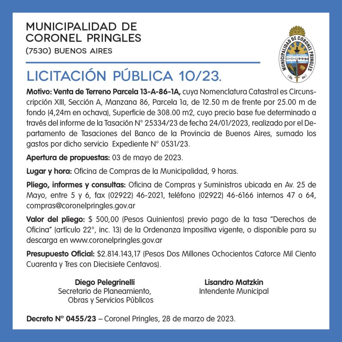 Decreto N° 0455/23 – Coronel Pringles, 28 de marzo de 2023.