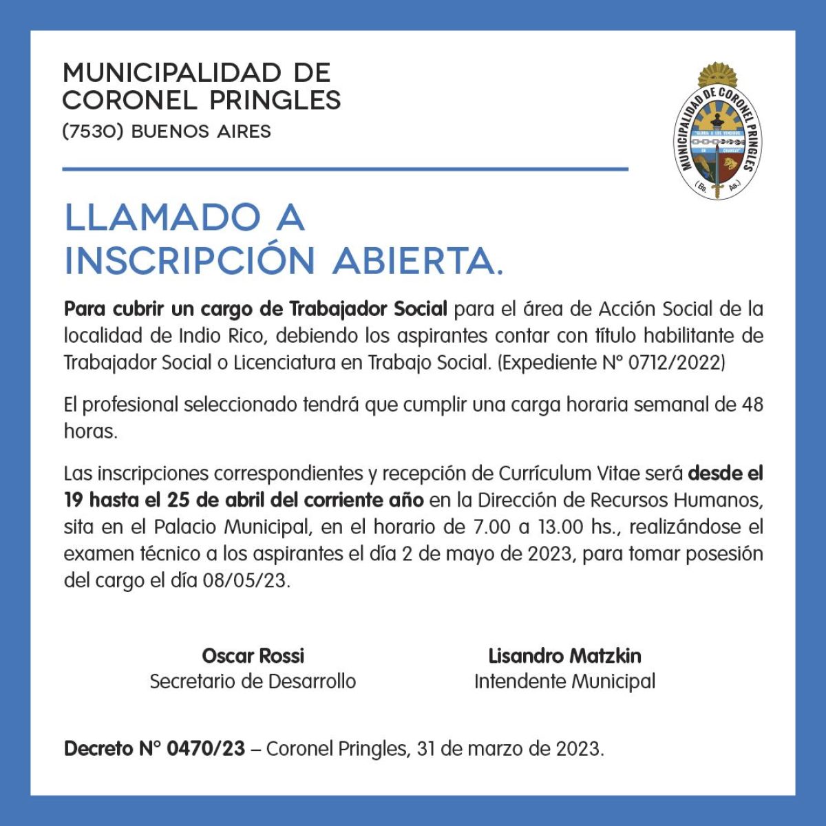 Decreto N° 0470/23 – Coronel Pringles, 31 de marzo de 2023.