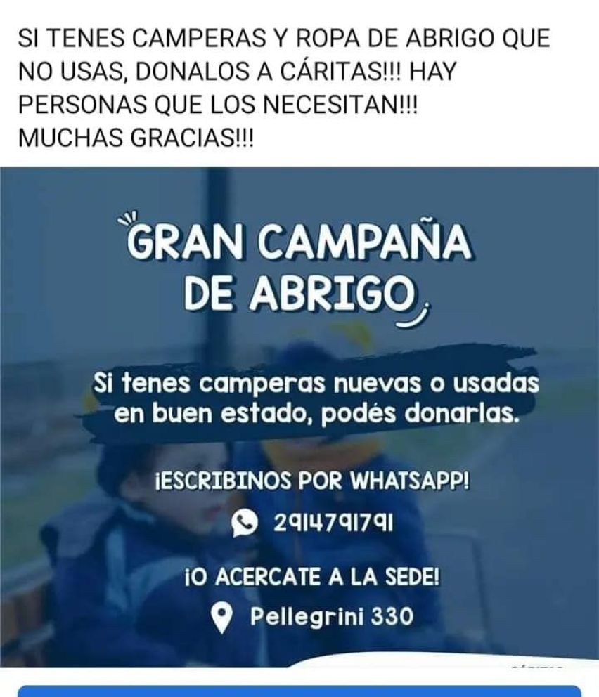 Como todos saben, se acerca la temporada invernal y Cáritas solicita colaboración para realizar la campaña de abrigo. Si tenes alguna campera o frazada que desees donar para alguien que lo necesite, acercate a Cáritas o comunicate por teléfono.