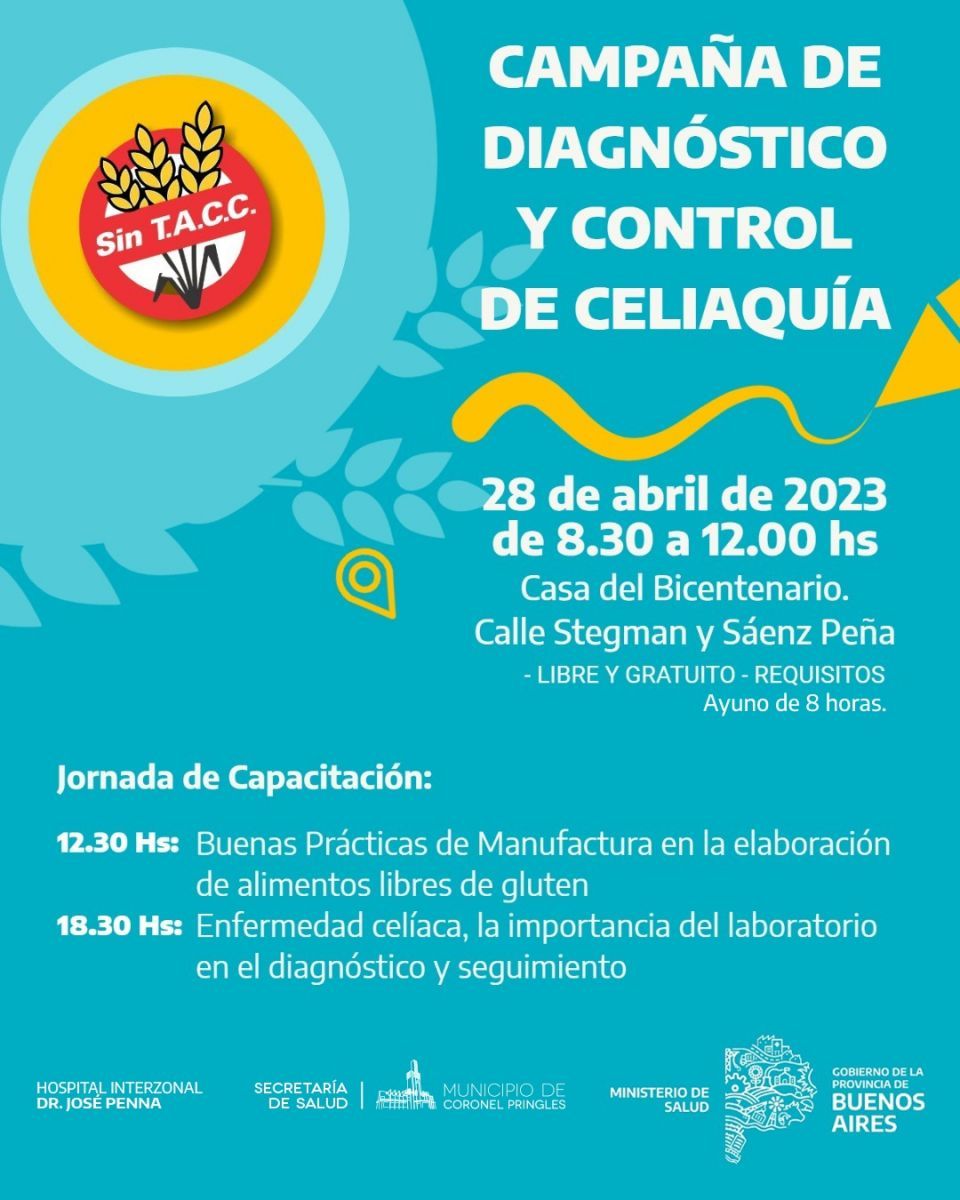 En el marco de las actividades programadas por el Mes de la Salud y en conmemoración al Día de la Celiaquía, que se recuerda cada 5 de mayo; “este viernes 28 de abril realizaremos en nuestra ciudad, conjuntamente con el Hospital Penna de Bahía Blanca y Región Sanitaria I, una jornada de capacitación y de detección de nuevos pacientes celiacos en Coronel Pringles”, comentó la Dra. Daniela Aguirre Luzi.