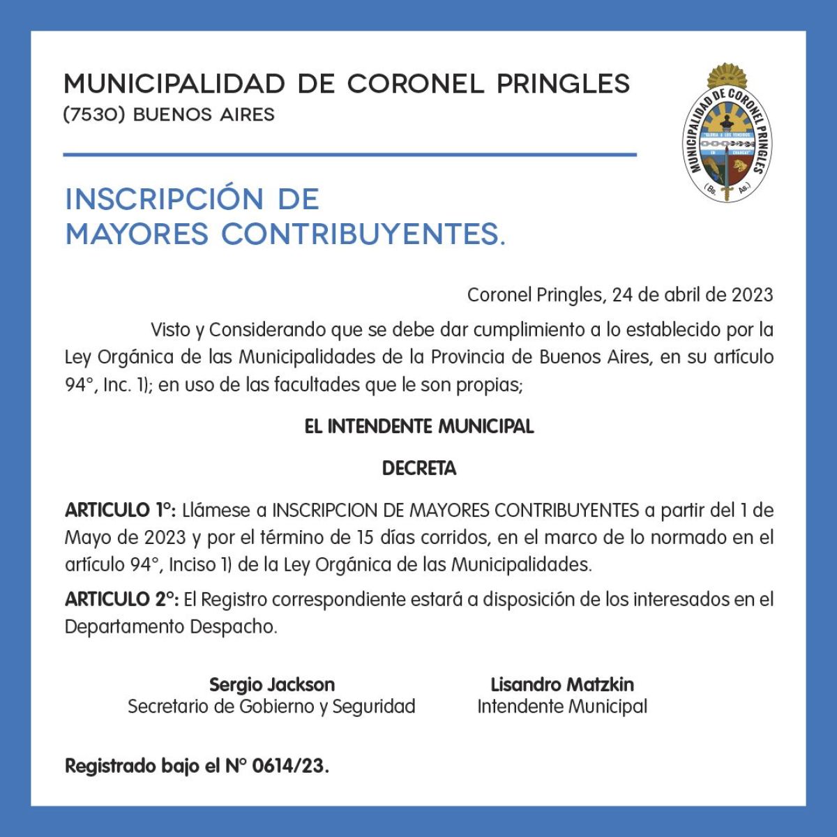 ARTICULO 1°: Llámese a INSCRIPCION DE MAYORES CONTRIBUYENTES a partir del 1 de Mayo de 2023 y por el término de 15 días corridos, en el marco de lo normado en el artículo 94°, Inciso 1) de la Ley Orgánica de las Municipalidades.