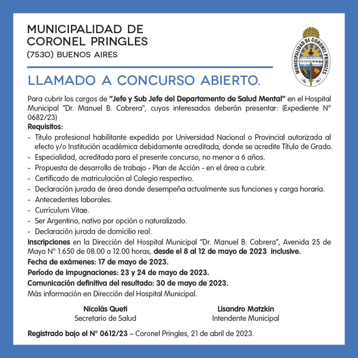 Para cubrir los cargos de “Jefe y Sub Jefe del Departamento de Salud Mental” en el Hospital Municipal “Dr. Manuel B. Cabrera”, cuyos interesados deberán presentar: (Expediente N° 0682/23)