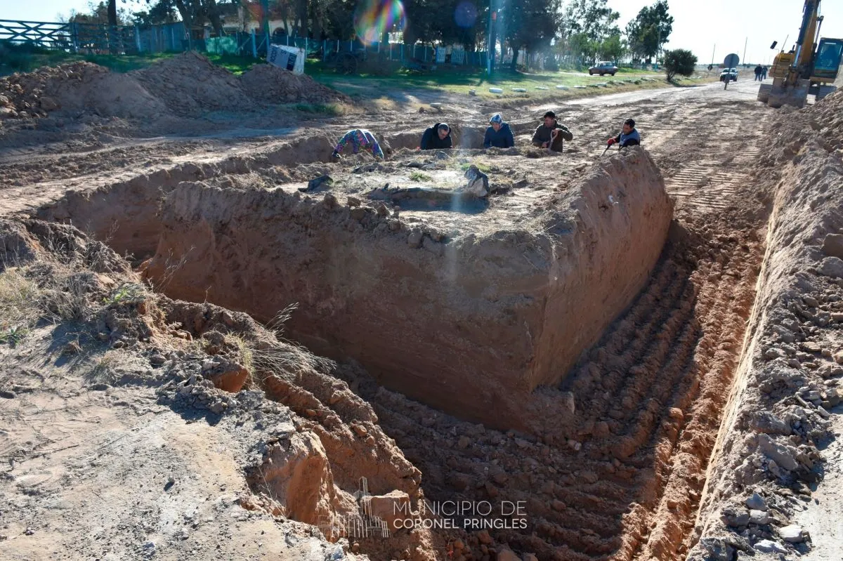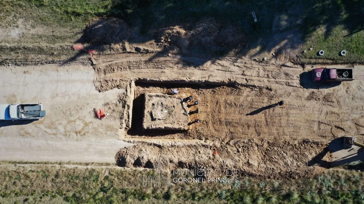 “Se comenzó a extraer tierra como parte del trabajo preliminar para después poner la estructura que será el cerco perimetral del fósil para después poder hacer la extracción completa del bloque que quedará encapsulado en una estructura que se diseñó específicamente para esto por un herrero local. Es un trabajo de ingeniería que nunca se ha hecho en Pringles porque es raro encontrar una situación de estas características. Todo está hecho a medida para esta circunstancia particular”, explicó Lucas Tobio.