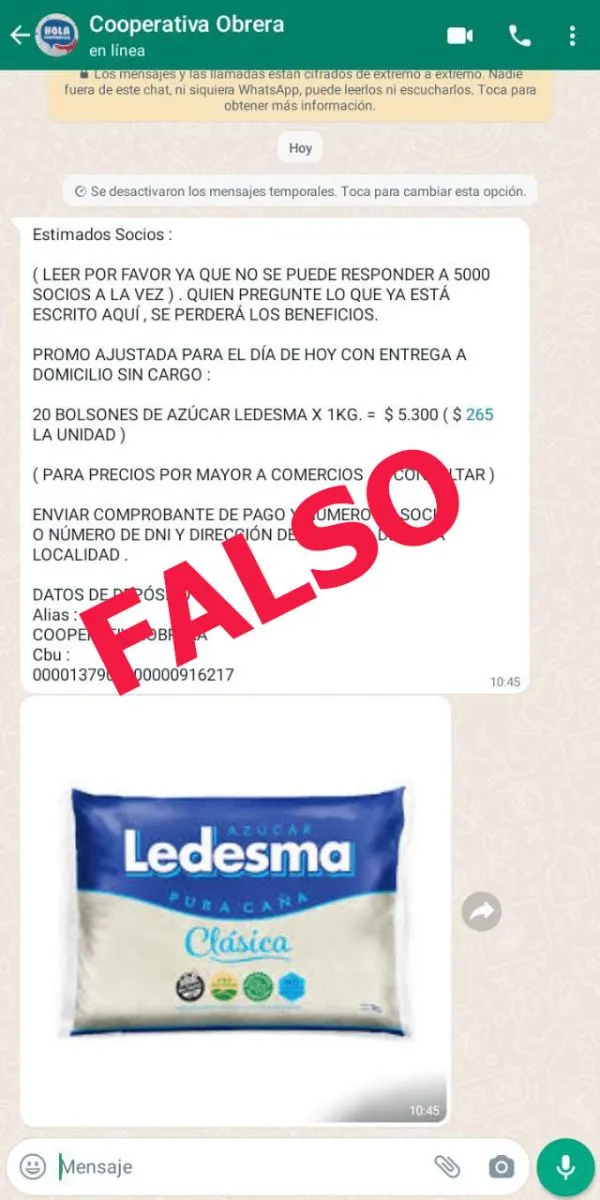 “Están circulando mensajes falsos conteniendo supuestas ofertas de La Coope. Los mismos han sido enviados mediante el número 291-4062914 a través de la aplicación WhatApp. Solicitamos borrar el mensaje y bajo ningún concepto hacer clic en los enlaces que hay dentro del mismo”, señaló la Cooperativa en su sitio web.