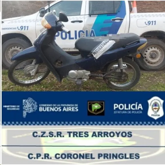 En una moto sustraída en la vecina localidad de Tres Arroyos. El personal policial De esta Dependencia en prolongación de Boulevard 40 de este medio detuvo la Marcha de un ciclomotor 110 cc, el cual era conducido por un masculino mayor de Edad, tras consultar sus datos y los del vehículo al sistema de informática 911, la Misma arrojo como resultado que el rodado menor registraba un secuestro activo Desde el año 2020 por el Juzgado UFI Nº4 desde la localidad vecina. Se le dio Intervención a la Ayudantía Loca