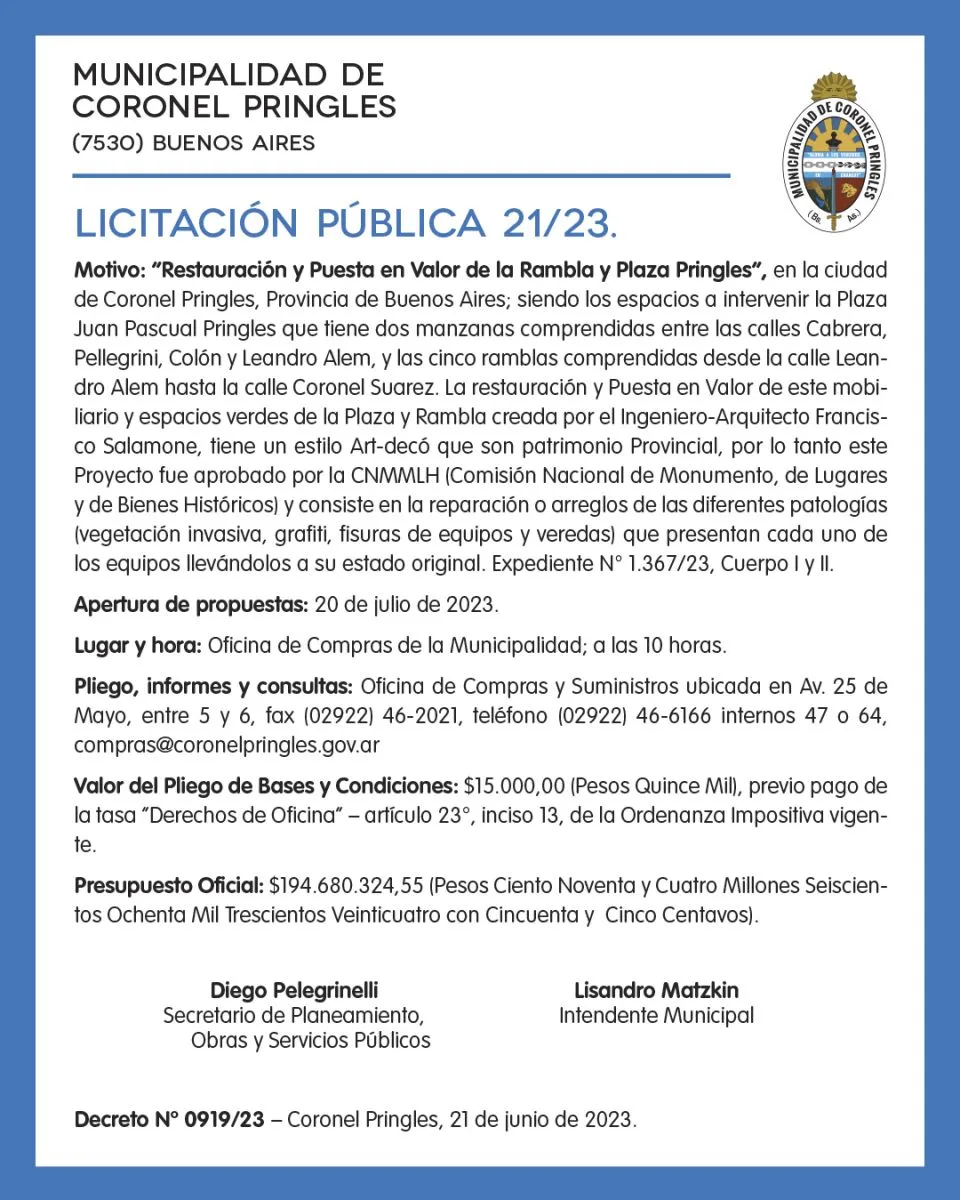 Motivo: “Restauración y Puesta en Valor de la Rambla y Plaza Pringles”, en la ciudad de Coronel Pringles, Provincia de Buenos Aires; siendo los espacios a intervenir la Plaza Juan Pascual Pringles que tiene dos manzanas comprendidas entre las calles Cabrera, Pellegrini, Colón y Leandro Alem, y las cinco ramblas comprendidas desde la calle Leandro Alem hasta la calle Coronel Suarez. La restauración y Puesta en Valor de este mobiliario y espacios verdes de la Plaza y Rambla creada por el Ingeniero-Arquitecto Francisco Salamone, tiene un estilo Art-decó que son patrimonio Provincial, por lo tanto este Proyecto fue aprobado por la CNMMLH (Comisión Nacional de Monumento, de Lugares y de Bienes Históricos) y consiste en la reparación o arreglos de las diferentes patologías (vegetación invasiva, grafiti, fisuras de equipos y veredas) que presentan cada uno de los equipos llevándolos a su estado original. Expediente N° 1.367/23, Cuerpo I y II.
