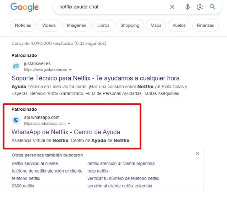 La mujer intentó encontrar ayuda para hacer esto e hizo una búsqueda en Google de “teléfono de Netflix atención al cliente”. Como el buscador ubica en los primeros lugares los resultados patrocinados, es decir, pagos, y no los destaca de manera muy visible, la vecina tocó un enlace en la que terminó en “un chat que se llama ‘Netflix Ayuda’ y como yo necesitaba hacer una consulta le escribí por problema que acusaba mi pantalla”, según contó la víctima a FM Reflejos.
