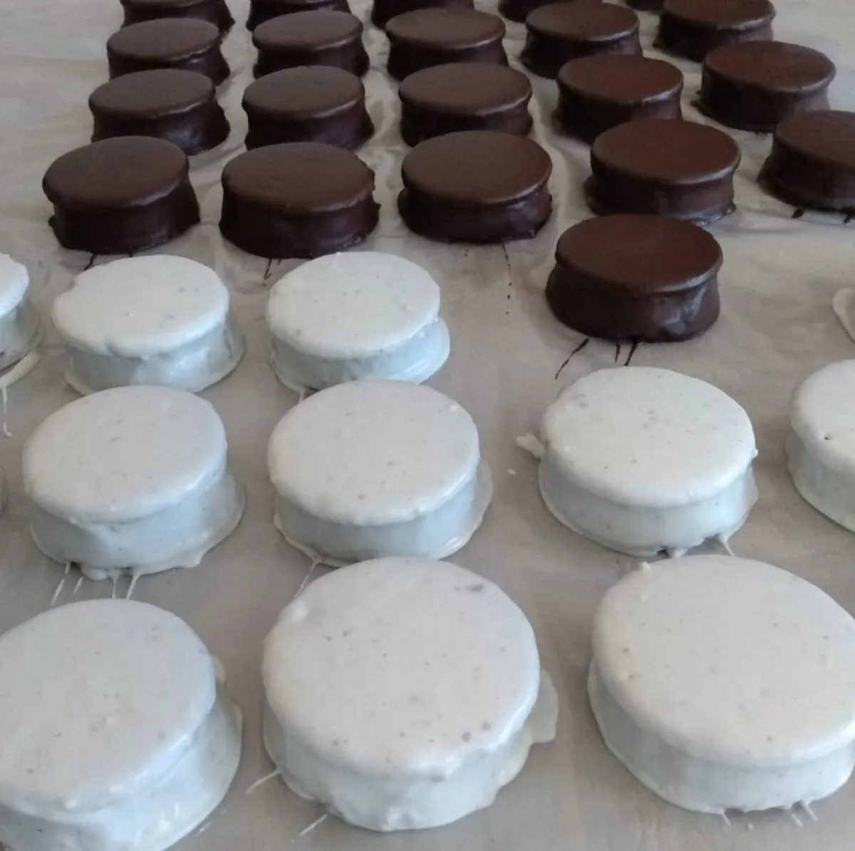 "El proceso lleva su tiempo, su maduración, y sigo haciendo todo muy artesanal. Por ahora sigo bañando alfajor por alfajor, buscando poder adquirir la bañadora para que la capa de chocolate sea la que lleva y no en exceso; y también estoy tratando de armar una dosificadora semiautomática de dulce de leche, que lleva sus costos".