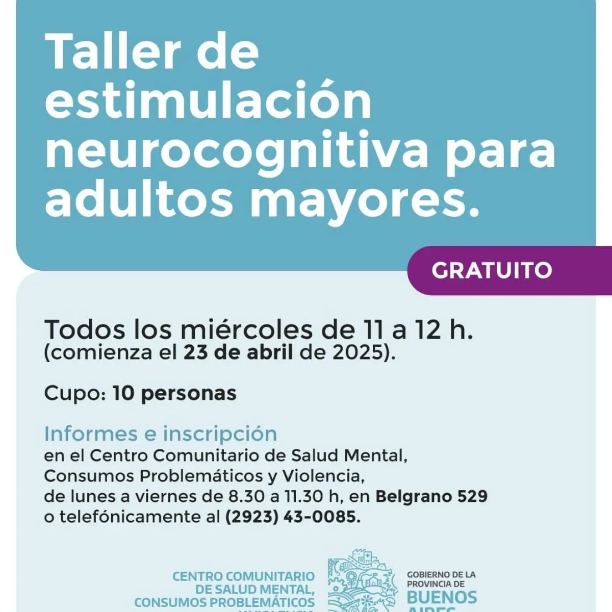 Estarán brindando un Taller de estimulación neurocognitiva para adultos mayores.