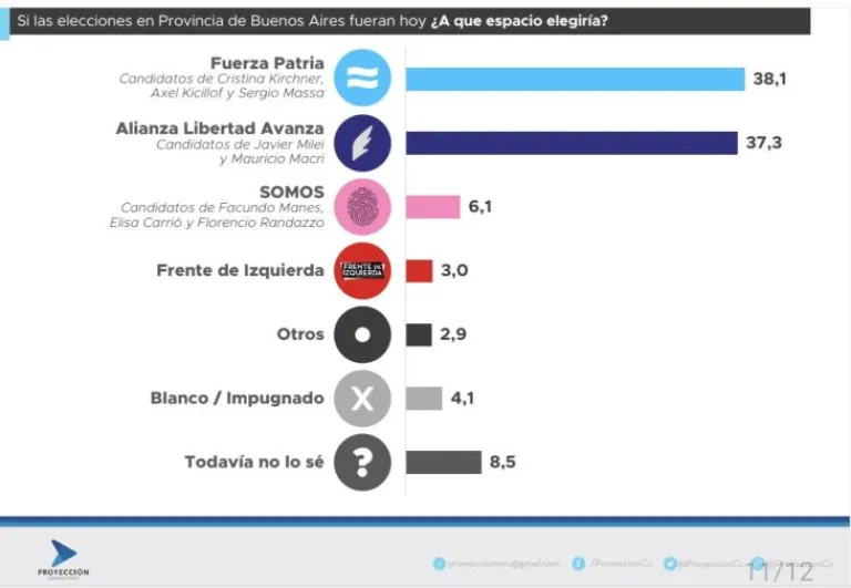 Un trabajo sobre muchos casos de la consultora Proyección, da una ventaja de 8 dédimas de Fueerza Patria sobre La Libertad Avanza: 38,1% a 37,3 en la suma total de votos.