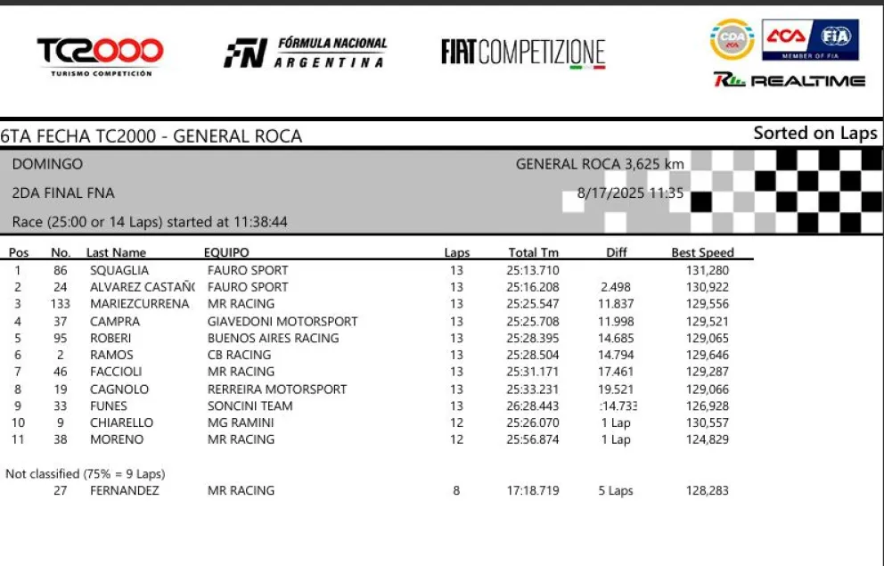 Los primeros diez lugares los completaron, Tomas Campra (Giavedoni Motor Sport), Santino Roberi (CB Racing), el Subcampeón Argentino 2024 Julián Ramos (CB Racing), Bautista Faccioli (MR Racing), Stefano Cagnolo (Ferreira Motor Sport), Valentina Funes (Soncini Team) y el Campeón Argentino 2025 Santiago Chiarello.