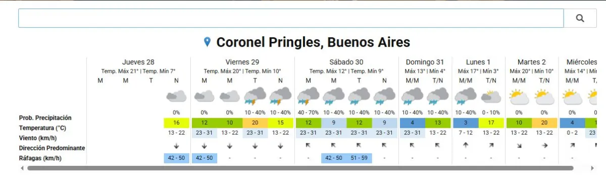 Coronel Pringles se prepara para un fin de semana marcado por la inestabilidad. Según el Servicio Meteorológico Nacional (SMN), desde este viernes y durante varios días consecutivos se registrarán lluvias y tormentas en la ciudad.