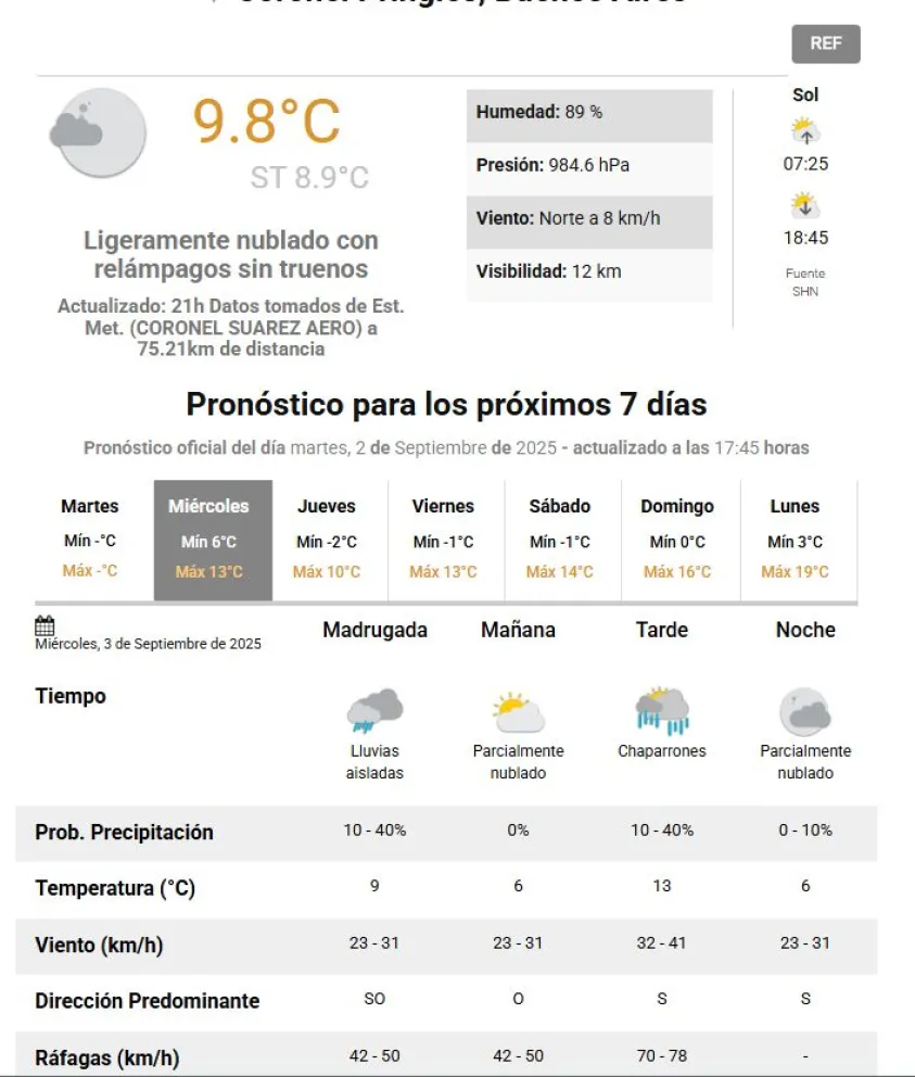 Además de Pringles, la advertencia para el miércoles incluye a Coronel Rosales, Villarino, Monte Hermoso, Patagones, Puan, Bajia Blanca, Coronel Suárez, Saavedra y Tornquist, además del sur de Coronel Dorrego. También incluye buena parte de la provincia de La Pampa y el noreste de Río Negro.