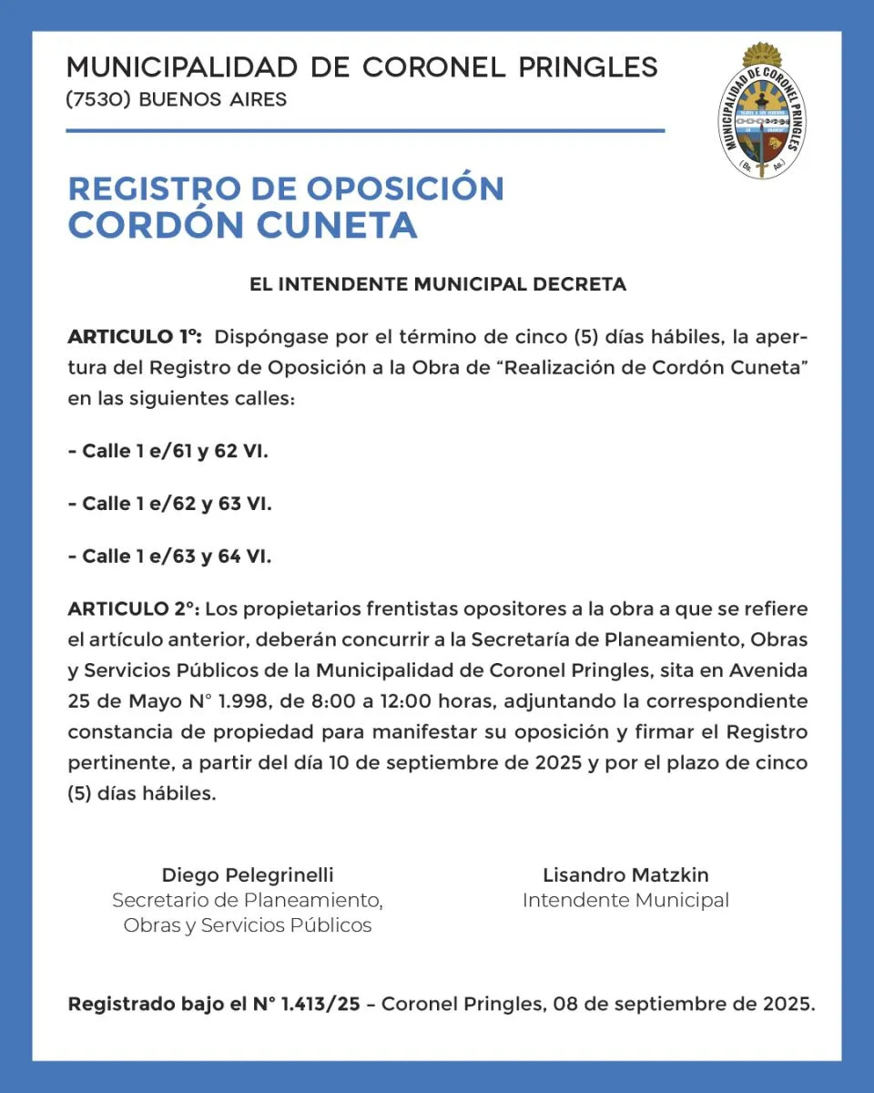 ARTICULO 2°: Los propietarios frentistas opositores a la obra a que se refiere el artículo anterior, deberán concurrir a la Secretaría de Planeamiento, Obras y Servicios Públicos de la Municipalidad de Coronel Pringles, sita en Avenida 25 de Mayo Nº 1.998, de 8:00 a 12:00 horas, adjuntando la correspondiente constancia de propiedad para manifestar su oposición y firmar el Registro pertinente, a partir del día 10 de septiembre de 2025 y por el plazo de cinco (5) días hábiles.